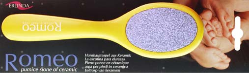 ROMEO, Ceramic Pumice Stone, 6 3/4", yellow, handle bottom side dark blue blistercarded quantity